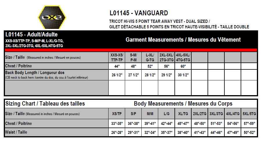 130 GSM - 3.8 oz./yd2 - 6.5 oz./lin. yd. 100% polyester tricot knit. 5-point tape fastener tear-away safety design. 4 front storage pockets. Reflective radio clip strap on front shoulders. Durable binding. D-ring access slot on back. 2" retroreflective stripe with 4" fluorescent background stripe on front and back body. Meets CSA standards.
